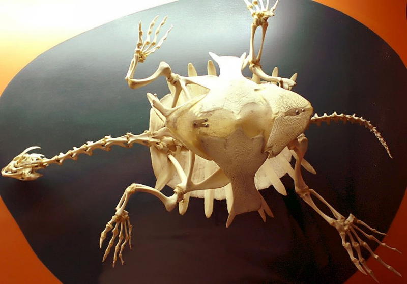 スッポンの形態 形態的にはスッポンは英語で softshell turtle と呼称され、確かに骨格を観察すると、背甲の周辺部の肋骨が互いに癒合することなく、分離して櫛の歯の様に突き出ており、詰まりはスッポンの甲羅の周辺は柔らかく、皮革様を呈します。時々、古道具屋の店頭に額入りのスッポンの甲羅が並んで居る事が有りますが、初めて見た人は、何か人工的な造りものと勘違いするかもしれません。腹甲も退化的で、腹側を覆う面積も小さくて、腹の前後端はこれまた皮革様で柔らかいのです。この様な甲羅の柔軟性−甲羅の皮骨由来の部分の退化・後退傾向−は水中遊泳する時に、甲羅周辺に発生する水の乱流を抑えて滑らかな遊泳に寄与する可能性はありそうです。ガチガチに固めた甲羅で水中をゆっくり泳ぐ戦略に対し、捕食者から身を守る為の装備を軽くしても素速く泳いで逃げる道を選んだとも言えるでしょう。まぁ、戦車に対する装甲車の様な位置づけかもしれませんね。その分、人間が調理加工し易い訳でもありますが。 腹側で硬い甲羅で覆われるのは身体の中域の部分がメインですので、その頭側と尾側は甲羅が退化的で、細い箸の様な構造であったり、左右幅を縮めていたりしており、ヘリの付近は柔らかい状態です。詰まり、前後肢はその付け根の骨である肩帯、腰帯まで<剥き出し>であり、この点は、それが肋骨で構成される胸郭の背側部分に覆われている以外は、他の爬虫類と同様と言えます。尤も、肩帯の腹側端にアンカーを与えるべく、その部分の骨要素は遺している様に見えます。特に前肢の付け根の骨である前肢帯が腹側の腹甲の骨要素どの程度に力学的な連結をしているのか問い直すと面白ろそうに思います。この辺をスッポンの異なる種同士間の、また他のカメとの比較を交え、機能形態的な解析を試みて前肢−肩帯構造の進化を語ると面白そうです。志有る若者に対して、スッポン業界が材料の提供並びに資金援助をして戴けたらとも思って居ます。 尚、スッポンのこの様な骨格の様相が、カメが甲羅の無い生き物から進化する途中の状態を示すのか、或いはカメとして完成したものが甲羅を二次的に退化させている段階にあるのかは、判断が分かれるところと思いますが、院長は、退化説を採りたいと考えます。これは1つには、肩帯が胸郭に取り込まれる過程に於いて、背側、腹側共にまず堅固な構造体の中に取り込まれ、両者との癒合によって前肢支持のアンカーとして機能し得た可能性を考えるからです。この際に、カメ固有の簡略化した肩帯構造も得ていますが、腹側の甲羅が無い状態では、この様な肩帯の構造的改変が起こり得なかっただろうと考えるからです。各種スッポンで、腹甲の退化の程度が異なりつつも、一応は肩帯のアンカーポイントを遺している姿からも、甲羅を固める進化の途中にあるのではなく、必要な構造をギリギリまで遺している退化過程にあると考えるべきと思います。まぁ、三叉状に完成された肩帯の形状−カメとしての完成形を示している−がモノを言っているとの判断です。 |